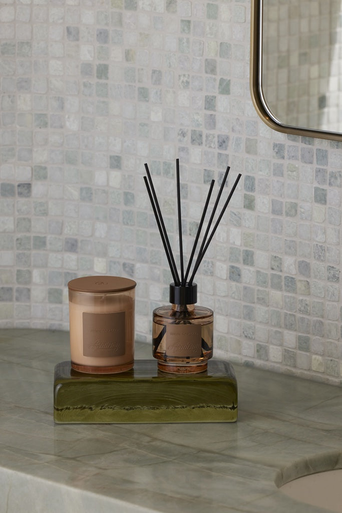 This Bernard Glass Brick Sculpture brings a pop of colour to your space with a bold olive green glass construction.