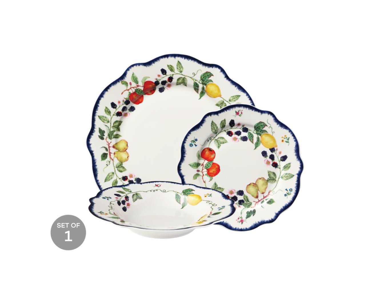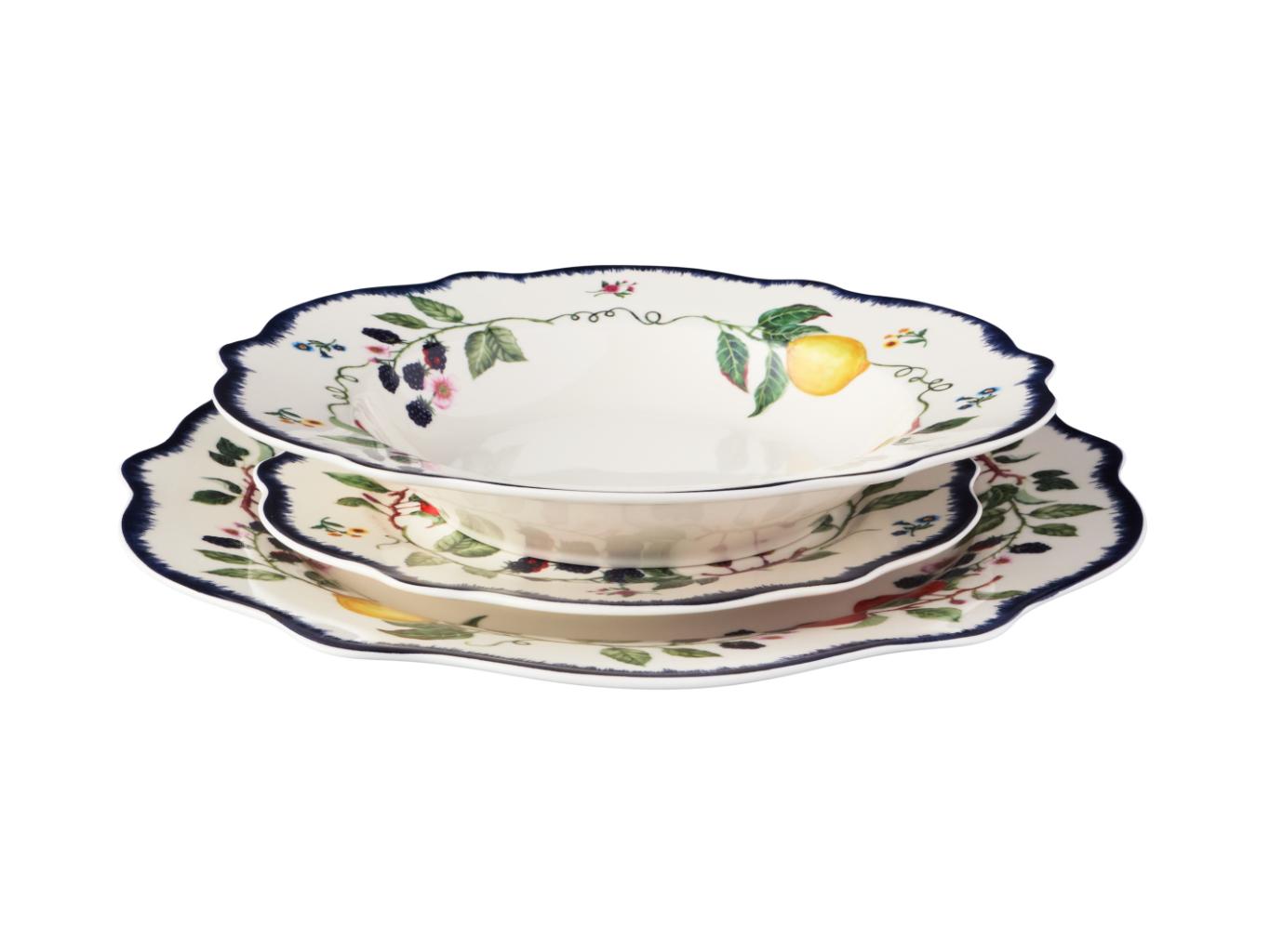 Brighten your table with the Frutta scalloped rim dinner set, inspired by the warmth of Mediterranean life. With vintage-style fruit motifs and a navy scalloped edge, this charming porcelain set brings colour, tradition and playful elegance to everyday meals or casual entertaining. A beautiful way to celebrate the joy of shared dining.