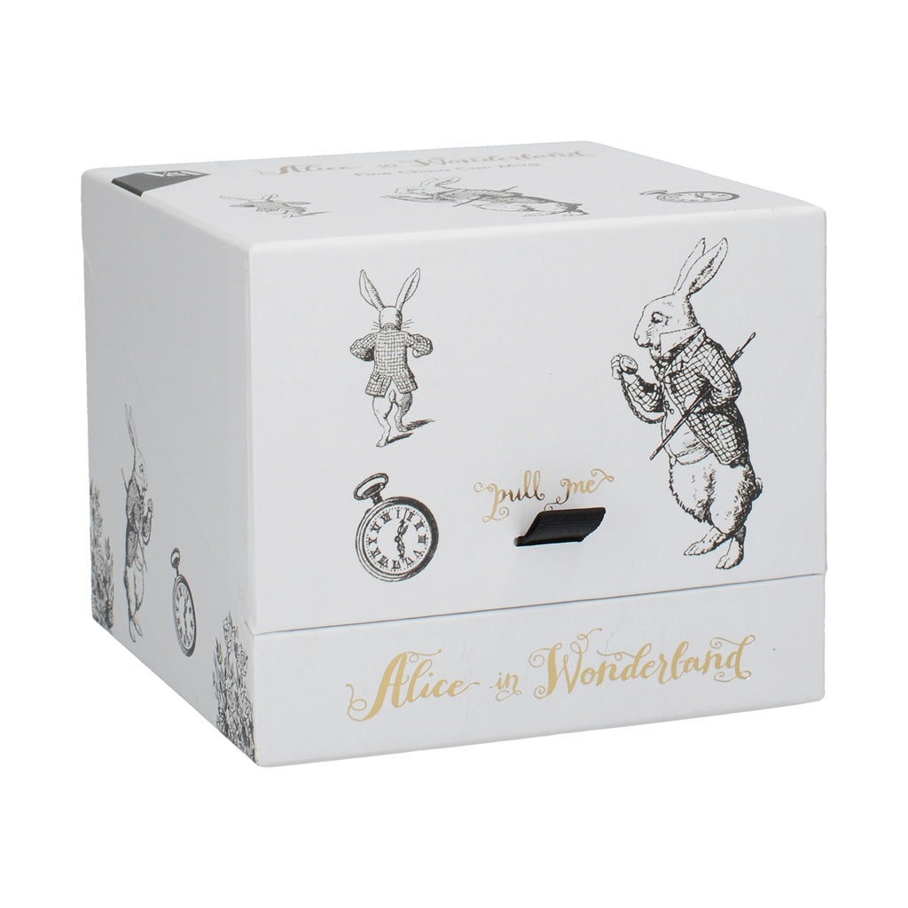 Turn daily coffee breaks in to your very own Mad Hatter's tea party, by sipping hot drinks from this lovely white mug, from the Alice in Wonderland collection, by V&A. This mug is decorated with a black and white illustration of the White Rabbit. Snappily dressed in a waist coat and blazer, he checks his pocket watch, which is finished in stunning gold detail. The design is inspired by the Alice in Wonderland card game, with artwork by Sir John Tenniel (1820 - 1914). His famous fret, ‘Oh dear! Oh dear! I shall be too late!’ lines the inside rim of the mug. Turn the tea mug around and you’ll see the White Rabbit scampering off in to the distance, capturing the moment that Alice’s adventures first began. And that's not all! Just like Wonderland, this mug is packed with new surprises at every turn. Finish your drink and you'll see the image of his pocket watch appear in the base.